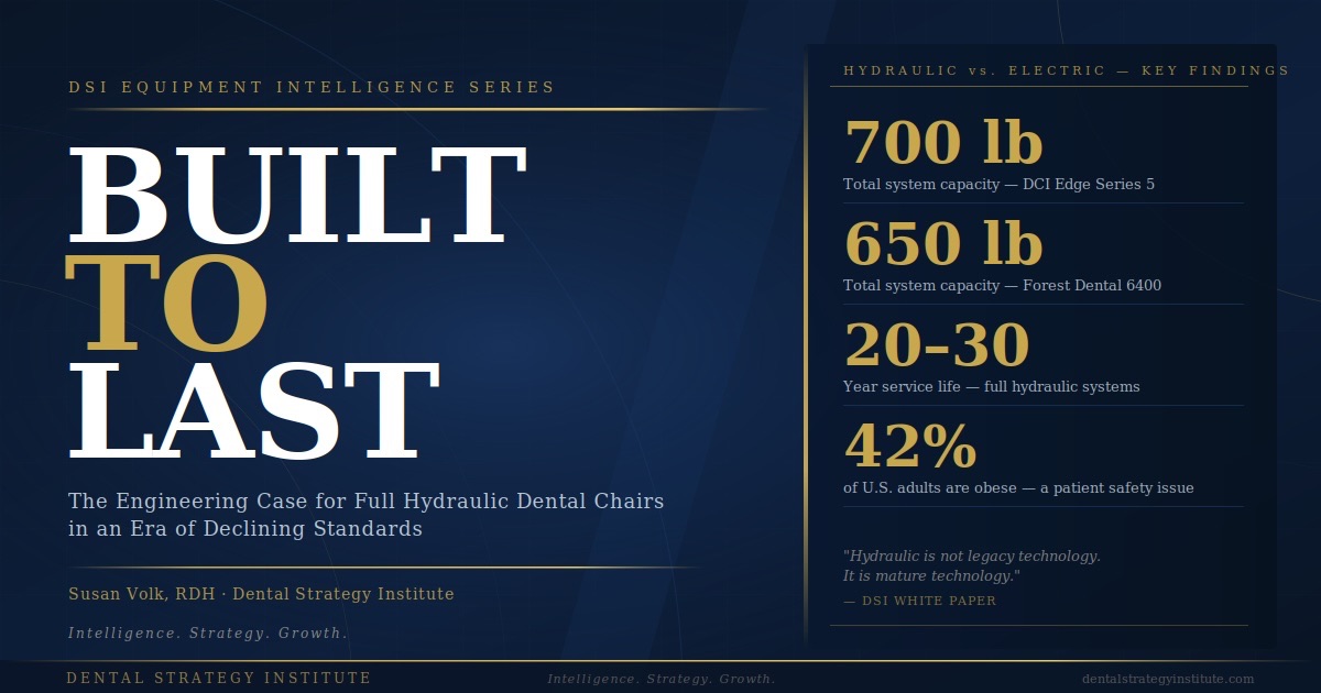 Why fully hydraulic systems outperform hybrid and electric alternatives on weight capacity, service life, noise, and total cost of ownership — and why the industry is quietly regressing toward inferior technology. Includes U.S. brand profiles for A-dec, Midmark, DCI Edge, Forest Dental, Belmont, and Firstar